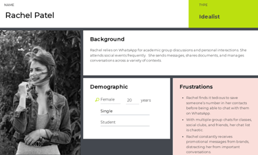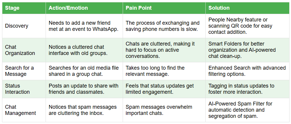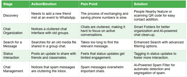 To understand the user experience better, I developed a user journey map, outlining the key stages and emotions a user goes through when interacting with WhatsApp. This map helped identify areas where users faced friction and provided insights into how new features could alleviate these pain points.