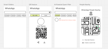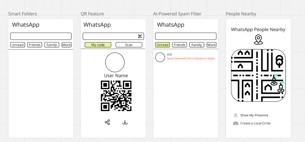 After prioritizing the features, I created low-fidelity wireframes to visualize the proposed solutions. The wireframes focused on the most essential user flows, such as chat organization using Smart Folders, managing spam messages with AI-powered filtering, and adding contacts using QR codes or People Nearby