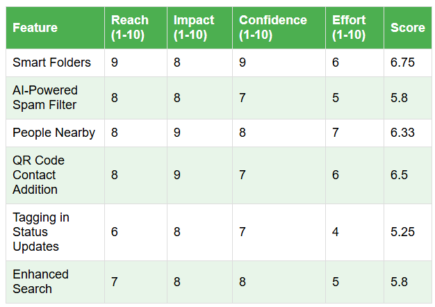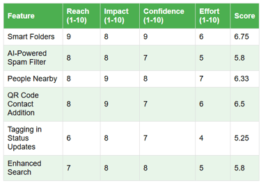 This framework was used to rank the proposed features based on their expected reach, impact, confidence in success, and the effort required to build them.