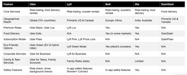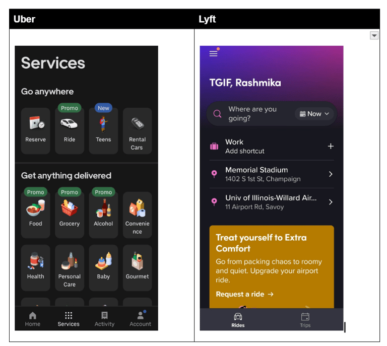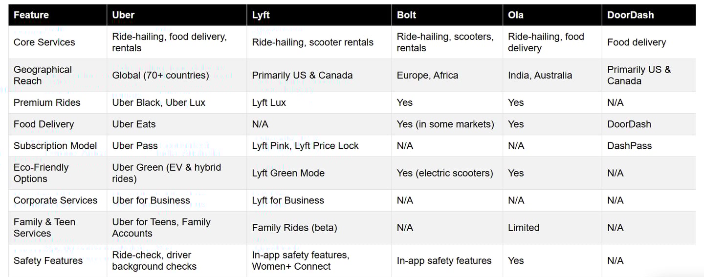 Diverse Service Offerings: Uber’s range includes Uber Eats, Uber Reserve, and rental cars, making it a one-stop shop for various transportation needs, while competitors like Lyft focus primarily on ride-hailing.